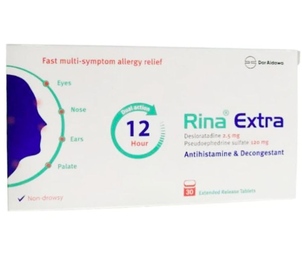 رينا® إكسترا هو دواء يحتوي على ديسلوراتادين (مضاد للهيستامين) وبسودوإيفيدرين (مزيل احتقان الأنف). يستخدم للسيطرة على أعراض التهاب الأنف التحسسي الموسمي مثل: