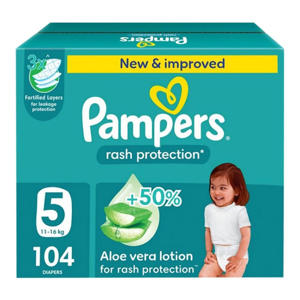 • حفاضات بامبرز مزودة بشريط لاصق وطبقة إضافية من لوشن الألوفيرا تقدم فوائد ترطيب إضافية لحماية بشرة أطفالك من الطفح الجلدي.