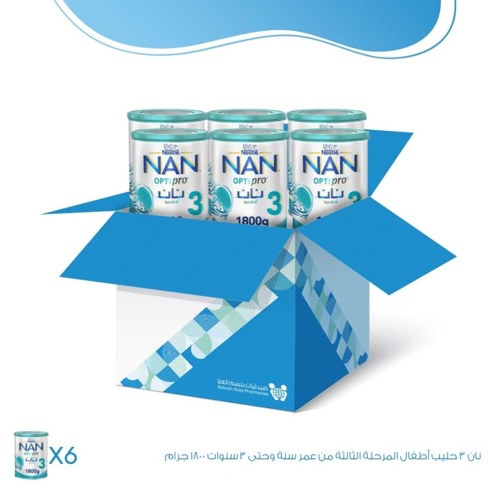 كرتون - نان 3 حليب أطفال المرحلة الثالثة من عمر سنة وحتى 3 سنوات 1800 جرام - 6 علب