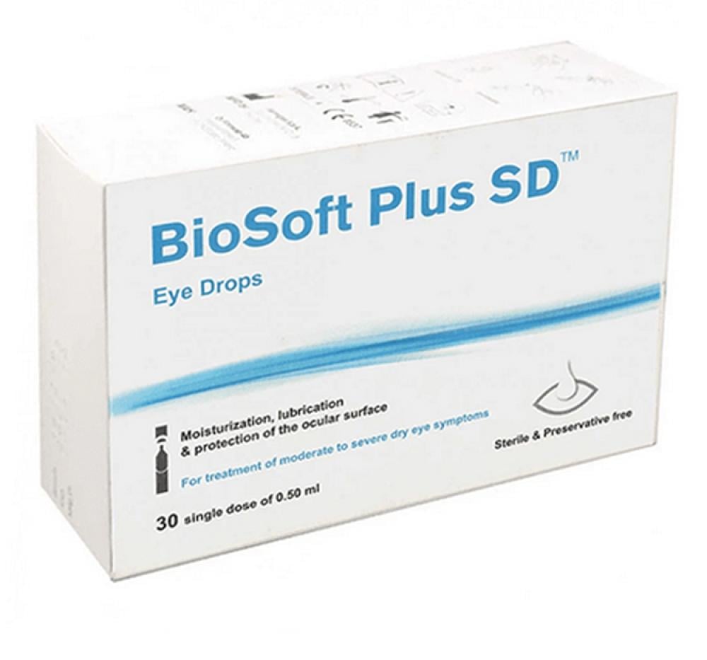بيو سوفت بلس إس دي بلس إس دي تحتوي على هيالورونات الصوديوم، وتريهالوز، وتستخدم لتخفيف جفاف العين الشديد، وحساسية العين، وتهيج ما بعد الجراحة، وآمنة للاستخدام مع العدسات اللاصقة.