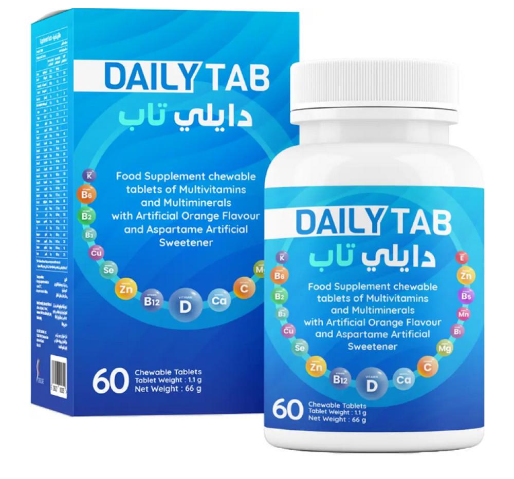 - ديلي تاب 60 قرص قابل للمضغ هو مزيج مثالي من الفيتامينات والعناصر الأساسية ومضادات الأكسدة التي تدعم الاحتياجات اليومية الموصى بها من الفيتامينات والمعادن.