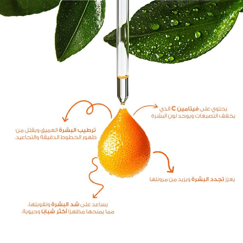 - يحتوي على فيتامين C الذي يخفف التصبغات ويوحد لون البشرة عبر تثبيط نشاط التيروزيناز، وهو الإنزيم الأساسي المسؤول عن تكوين الميلانين.