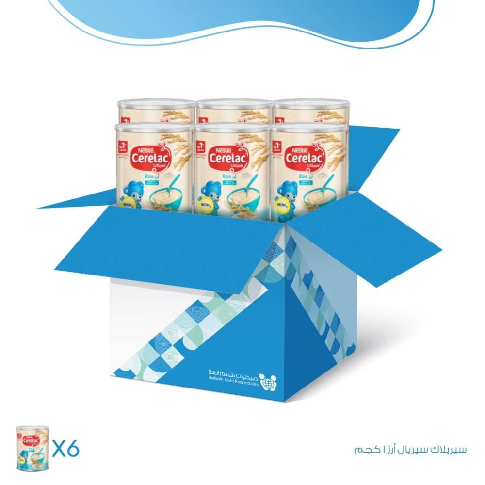 - نستله سيريلاك دقيق الحبوب للأطفال بالحديد والأرز وزن 1 كجم لطفلكِ بدءًا من عمر 6 أشهر- 6 علب
